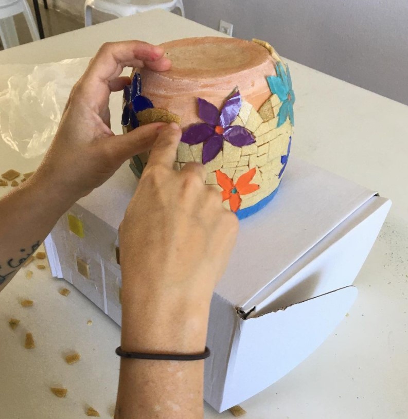 O Curso de Mosaico representa a colagem de pequenas peças próximas umas das outras onde estabelecerão um efeito visual (desenhos, figuras, representações). Usando de azulejos cerâmicos, pastilhas de vidro e/ou vidros coloridos (usados atualmente na construção de vitrais) como matérias primas. O aluno(a) aprenderá sobre a combinação de cores, organização, criatividade e paciência.